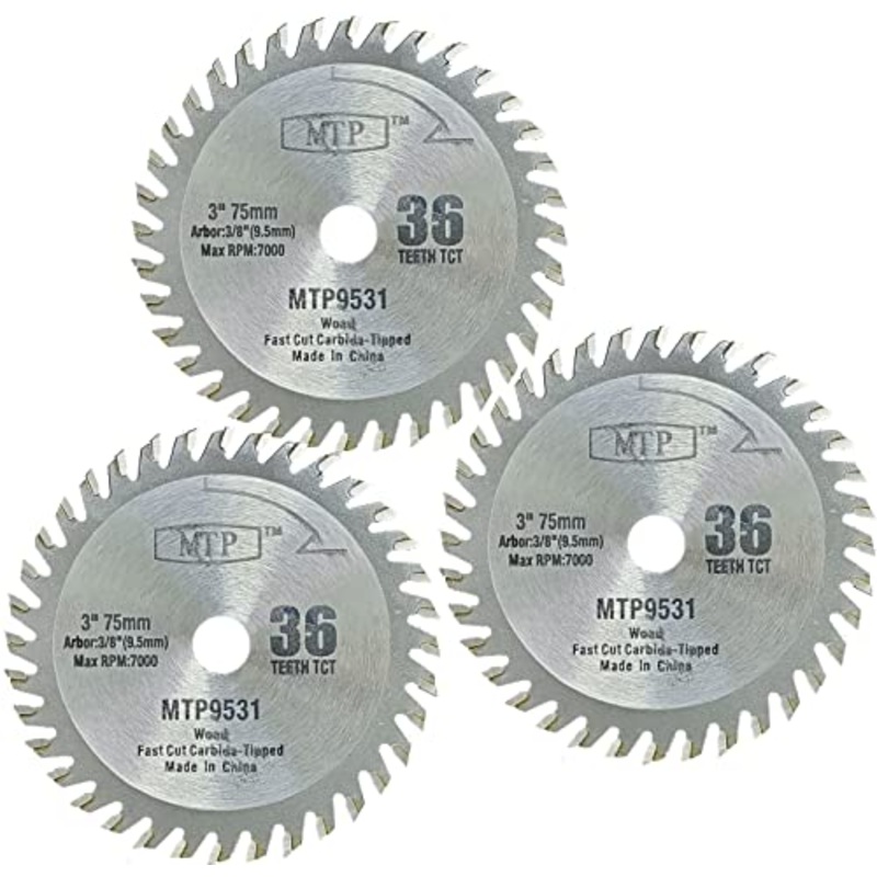 Brand: MTPFeatures: 3" 75mm in diameter Arbor: 3/8" (9.5mm) Thickness: 1mm36 Teeth TCT Circular Wood Saw Blade is made of construction-grade tungsten carbide. Fully Polished and Chrome Plated Surface provides a long-lasting usage life.Brand: MTPFit 3" Milw