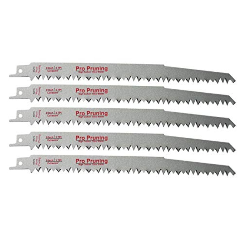 Brand: CaliastroColor: BlackFeatures: 5-pack of 9-inch wood pruning blades, 5 teeth per inchMade of High Quality Carbon Steel for fast wood cutting and pruningWorks with all major reciprocating saw brands such as DeWalt, Makita, Ridgid, Milwaukee, Porter &