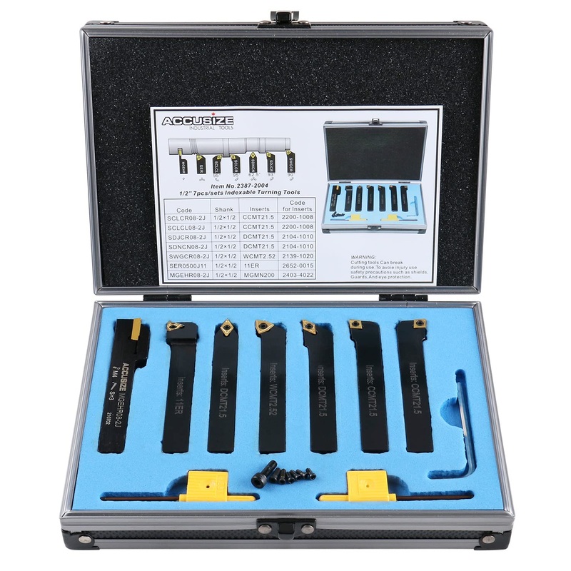Brand: Accusize Industrial ToolsFeatures: 7 piece indexable carbide lathe turning tool set. Shank size: 1/2 inch x 1/2 inch. Overall Length: 4"Model of each holder & the original insert: MGEHR08-2J (insert: MGMN200-M); SER0500J11 (insert: 11ER A60); SWGCR0