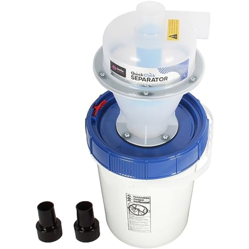The 98328 combines the Quick Click separator mounted on a five gallon heavy duty plastic pail with threaded lid fully assembled and ready to plug and play. Also included are two home shop vacuum adaptors 2.25″ to fit to the separator offering a 1.50″ male slip end to engage the hose both in and out of the separator. Reviews confirm the Quick Click separator has proven effective in both domestic and commercial use.