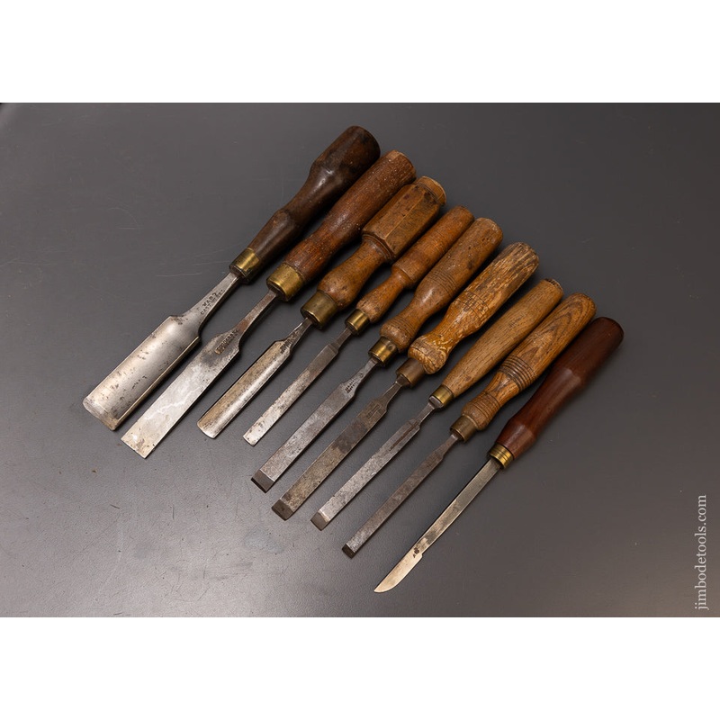 7 chisels and 2 gouges. Kenyon, Sorby, Ward, etc. Sized 3/8 to 1 1/4 inch.