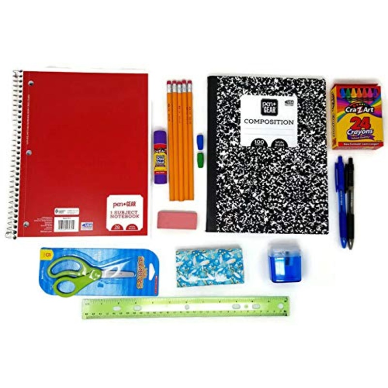 Details: Basic school supplies bundle of 18 Items: (5) Pen Gear #2 pencils, (1) washable glue stick, (1) 2 hole pencil sharpener, (1) 24-count box of Cra-Z-Art crayons, (1) pink eraser, (2) cap erasers, (1) 70-sheet spiral wide ruled notebook, (1) 100-sheet wide ruled composition notebook, (1) pair of kids blunt tip scissors, (1) pack of pocket tissues, (1) 12 inch ruler, (2) retractactable blue & black ink pens