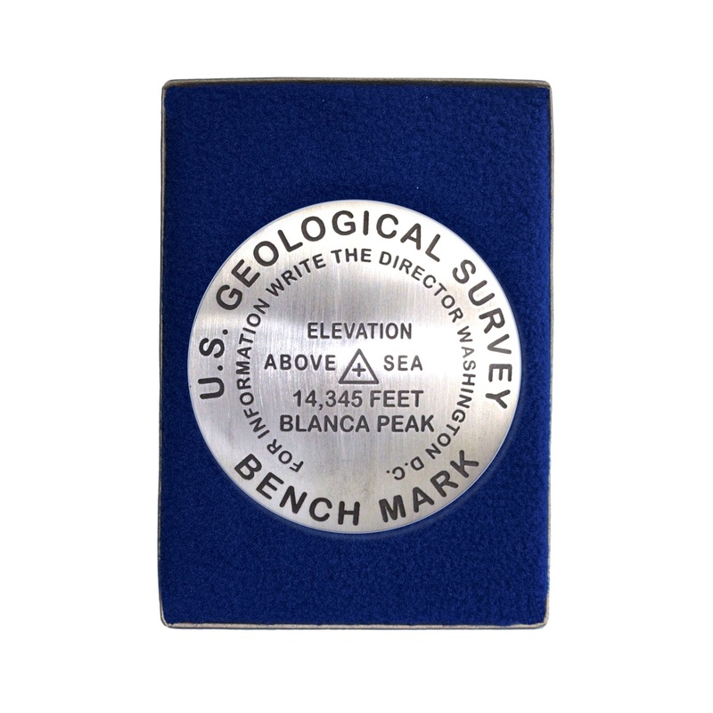 3 1/4 inch diameterCast in fine pewterButton Felt backingIn a fitted fleece interior of a clear-acrylic covered gift box.Place Name: Blanca Peak Elevation: 14,345 ft.Coordinates: N37 34' 38'' W105 29' 07'' Location: Sangre de Cristo Range, Colorado, USA Ma