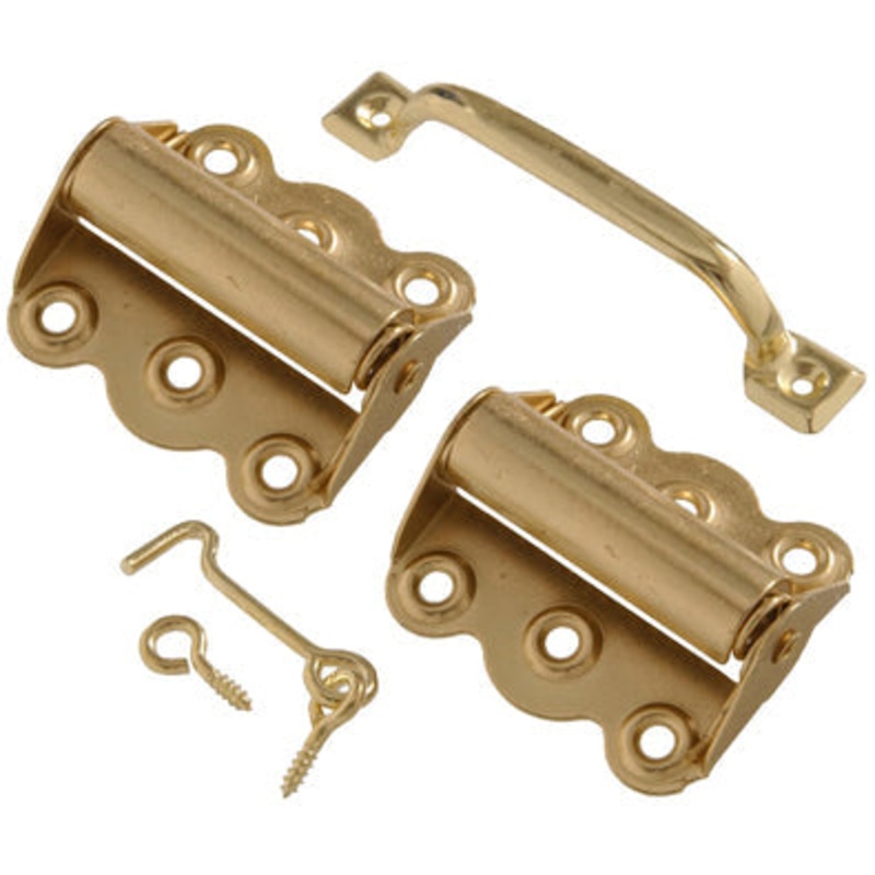 Kit includes components to mount and latch one door. Package includes instructions and mounting hardware. Spring door hinges. Brass finish.