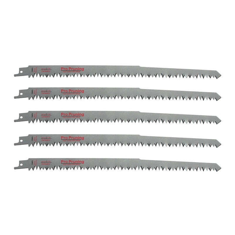 Brand: CaliastroColor: BlackFeatures: 5-pack of 12-inch wood pruning blades, 5 teeth per inchMade of High Quality Carbon Steel for fast wood cutting and pruningAt 1.4mm thick, the vibration of this blade is minimized allowing faster and more efficient cuts