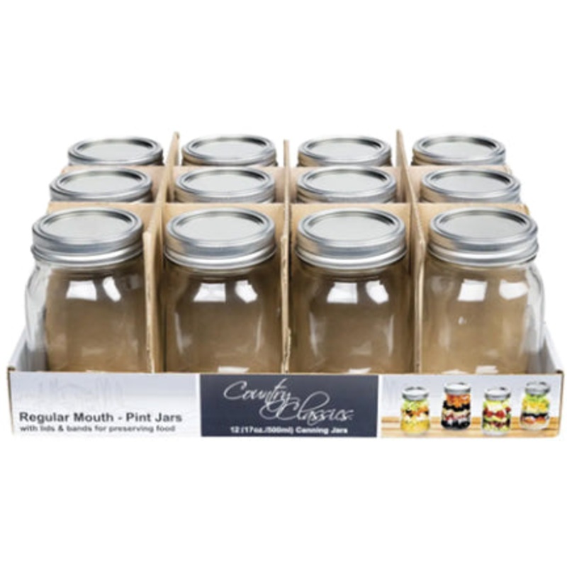 12 Pk. of 1 Pint (16oz.) Glass Canning Jars with Regular Mouth Lids and Bands. Perfect for preserving any foods. It does not stop there though, these jars can be used for any craft as well. Set comes with 12 jars, 12 lids and 12 bands ready for your next c