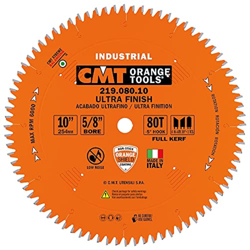 Details: Product DescriptionIndustrial PTFE-coated saw blades represent a great choice for the shop that keep their blades running all day, every day. This blade features a laser-cut heavy-gauge plate made of German Steel (46-48 Rockwell in hardness) to guarantee great cutting performance, also in saws with lots of power. The teeth are made of micrograin carbide brazed to the blade body through a special tri-metal metallic bond (copper-silver-copper) to last longer and deliver smooth cuts. The negative hook angle limits splintering and “climbing”. In addition this tool features expansion slots to reduce noise, along with anti-vibration design. Blades Non-Stick PTFE Coating keeps the blade running cool, reduces pitch build-up and protects against corrosion. Manufactured following precise procedures and perfectly balanced, this quality blade is delivered in unique CMT plastic case.From the ManufacturerMiter and radial arm saws offer you a wide range of uses, so CMT gives you a compound blade designed to meet their specifications. – the -5 degree hook angle, thin kerf and high tooth count allow you to make splinter-resistant top and bottom cuts in plywood, hardwoods, softwoods and laminates. – the negative hook keeps the blade from climbing at aggressive feed rates. With these features, CMT blades offer super performance on radial arm and miter saws and guarantee you a safer, more efficient working environment.
