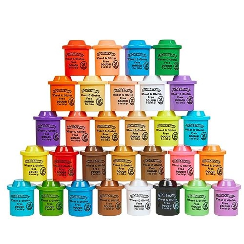 Details: Colorations has now got an amazing collection of 4 of our Wheat & Gluten Free dough. Kids love to create with their own hands! Our Wheat and Gluten Free Classic Dough is made for children who are wheat and gluten sensitive. Our allergen-free dough ensures that children with allergen sensitivities can enjoy playing with dough! Together in one kit we have 30 colors: orange, purple, green, pink, blue, yellow, red, light blue, almond, beige, peach, caramel, cinnamon, chocolate, russet, ebony, white, black, neon blue, neon green, neon orange, neon pink, neon yellow, neon purple, glitter blue, glitter orange, glitter white, glitter red, glitter purple, and glitter green.