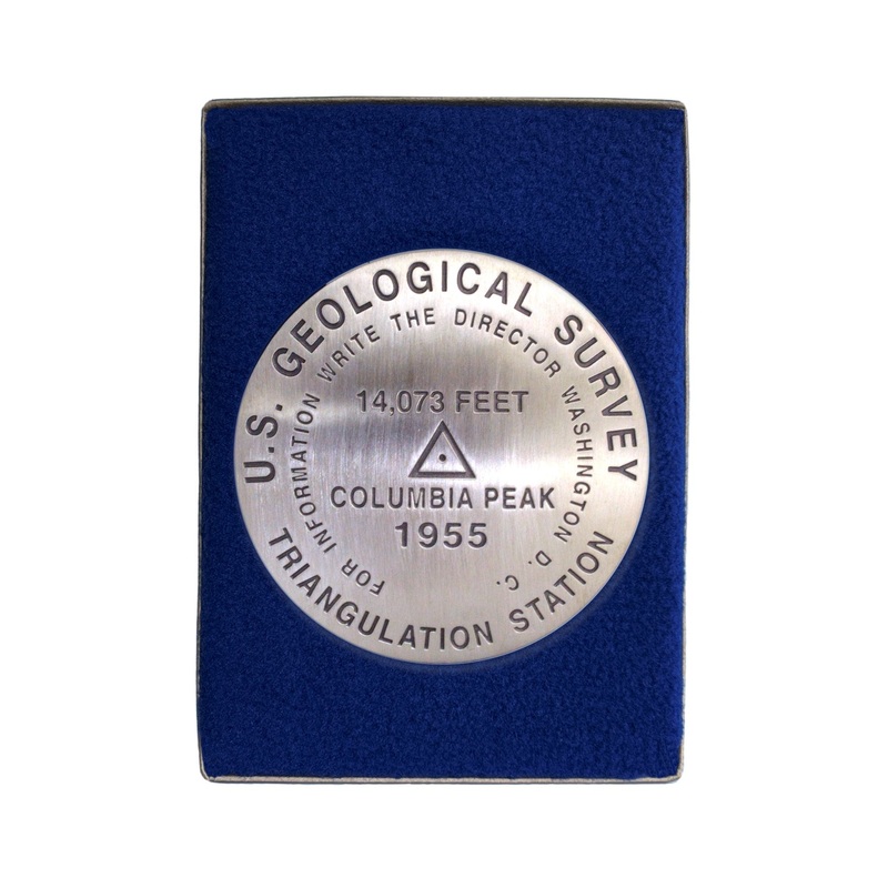 3 1/4 inch diameterCast in fine pewterButton Felt backingIn a fitted fleece interior of a clear-acrylic covered gift box.Place Name: Columbia Peak Elevation: 14,073 ft.Coordinates: N38 54' 14'' W106 17' 49'' Location: Sawatch Range, Colorado, USA MarkerSle
