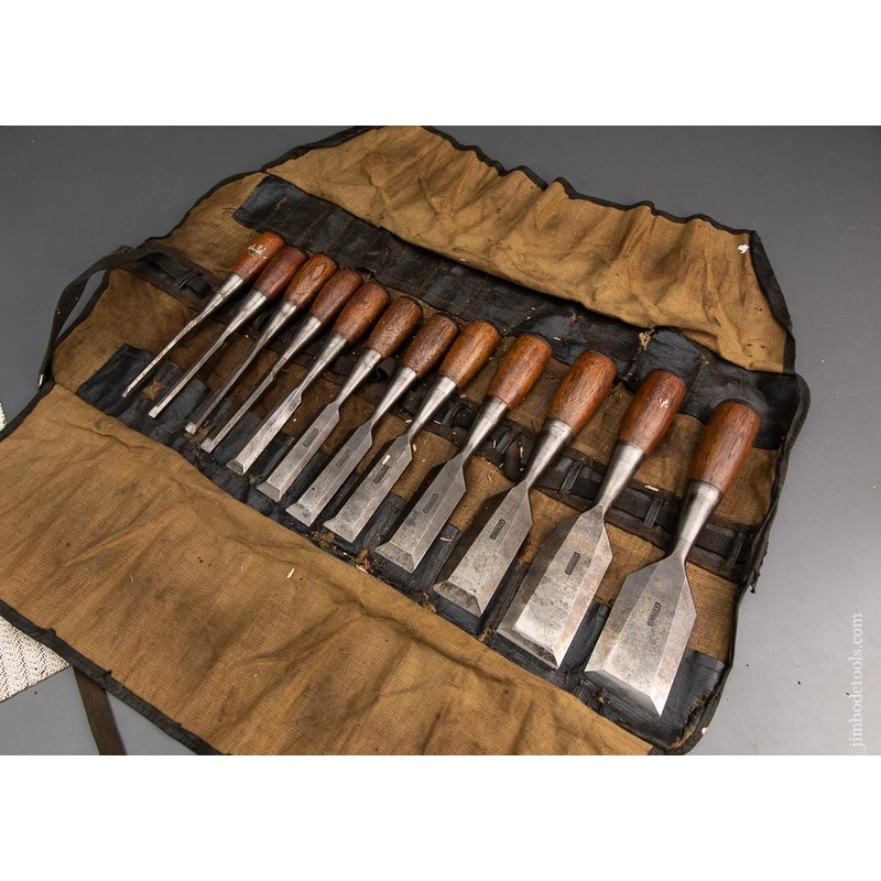 Set No. 320 of No. 50 Butt Chisels. They range in length from 8 to 9 inches. All are clean and fine except the 1 1/2, which has a chip near the edge. They all have the identical mark MADE IN USA PAT. 1493176 except the 5/8 which is a sweetheart.