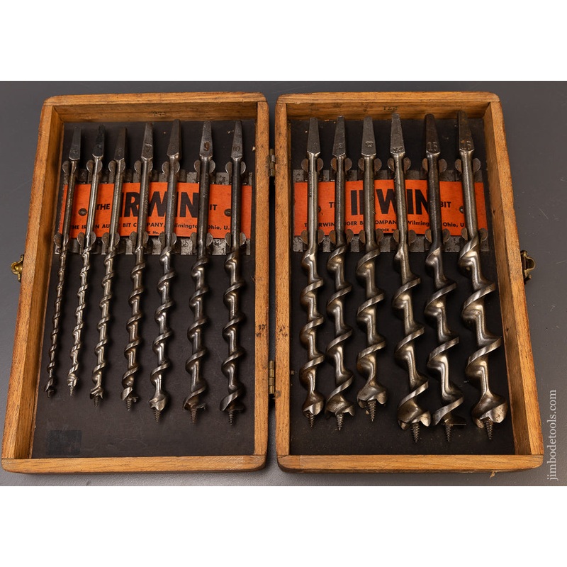 A complete UNUSED set. 1/4" through 1". Fine condition and ready to use. Coarse screws for faster cutting in green and softer woods. From the Irwin website: In 1884, Charles IRWIN owned a pharmacy in Martinsville, Ohio. A local blacksmith who was a custome