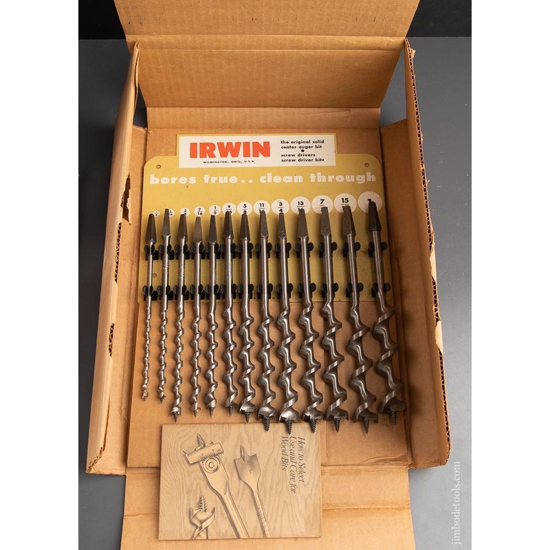 A complete set with display! 1/4" through 1". MINT condition and ready to use. Coarse screws for faster cutting in green and softer woods. From the Irwin website: In 1884, Charles IRWIN owned a pharmacy in Martinsville, Ohio. A local blacksmith who was a c