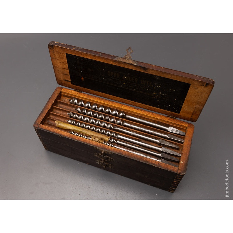 All good users bearing 2 different Russell Jennings logos. A complete graduated set of 13 bits. All marked Russell Jennings. All are bright, clean and sharp. Sizes 4 through 16 which correspond to 1/4 inch to 1 inch. The bits were patented in 1855. The three-tiered box was patented in 1890. They were bought out by Stanley in 1944. The best user auger bits ever made!