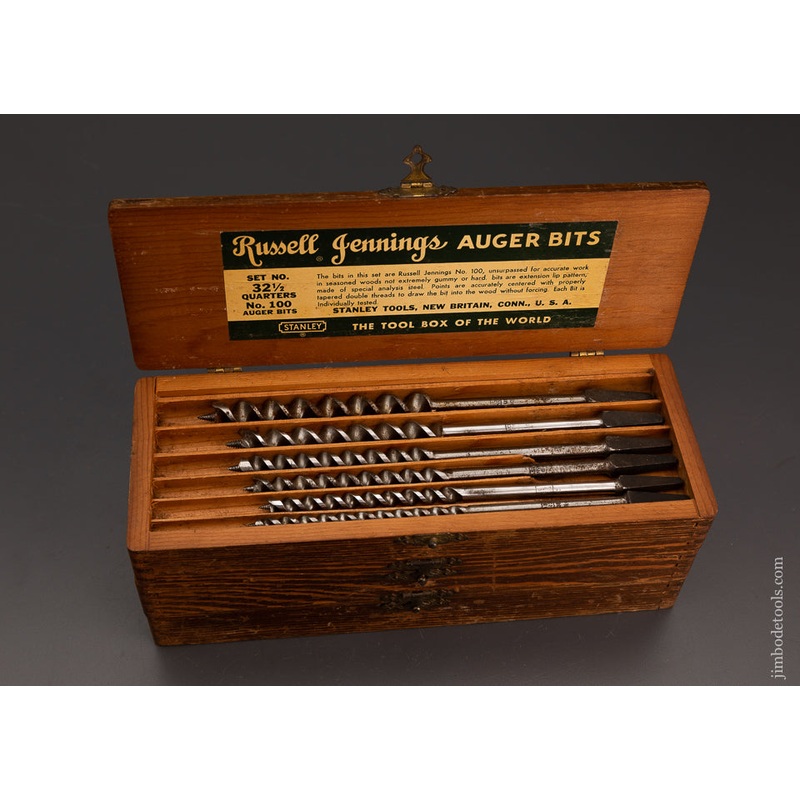 A complete graduated set of 13 bits. All marked Russell Jennings. All are bright, clean and sharp. Sizes 4 through 16 which correspond to 1/4 inch to 1 inch. The bits were patented in 1855. The three-tiered box was patented in 1890. They were bought out by Stanley in 1944. The best user auger bits ever made!