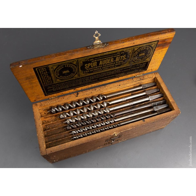A complete graduated set of 13 bits. All Jennings with different logos. All good user bits. All are bright, clean and sharp. Sizes 4 through 16 which correspond to 1/4 inch to 1 inch. The bits were patented in 1855. The three-tiered box was patented in 1890. They were bought out by Stanley in 1944. The best user auger bits ever made!