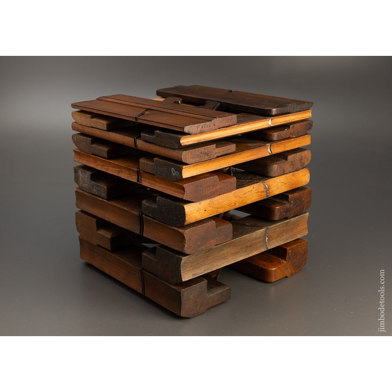 Complete set numbered 2 through 18. Various makers. Even numbered pairs. Clean, sharp and usable with little or no rust on most of the irons. Actually sharp enough to use right out of the box. Planes are in good, usable condition with their original irons and wedges. Average pitch is 55 degrees. Beech. 9 1/2 inches long. Approximately 3/16 to 1 1/2 inches wide.