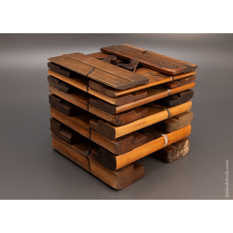 Complete set numbered 2 through 18. Various makers. Even numbered pairs. Clean, sharp and usable with little or no rust on most of the irons. Actually sharp enough to use right out of the box. Planes are in good, usable condition with their original irons and wedges. Average pitch is 55 degrees. Beech. 9 1/2 inches long. Approximately 3/16 to 1 1/2 inches wide.