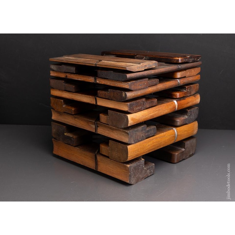 Complete set numbered 2 through 18. Various makers. Even numbered pairs. Clean, sharp and usable with no rust or pitting on the irons. Actually sharp enough to use right out of the box. Planes are in good, usable condition with their original irons and wedges. Average pitch is 55 degrees. Beech. 9 1/2 inches long. Approximately 3/16 to 1 1/2 inches wide.