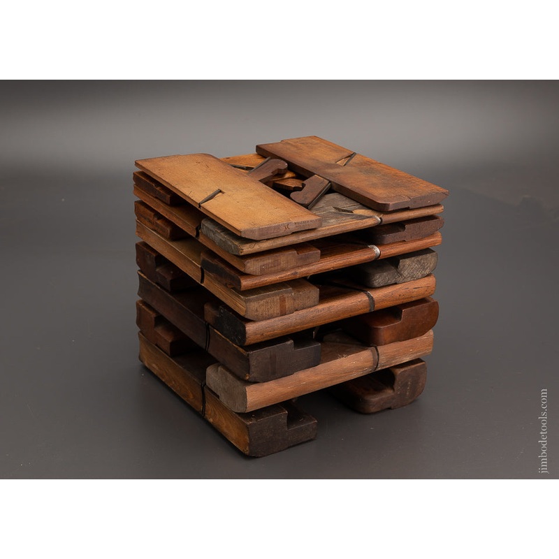 Complete set numbered 2 through 18. Even numbered pairs. Clean, sharp and usable with no rust or pitting on the irons. Actually sharp enough to use right out of the box. Planes are in good, usable condition with their original irons and wedges. Average pitch is 55 degrees. Beech. 9 1/2 inches long. Approximately 3/16 to 1 1/2 inches wide.