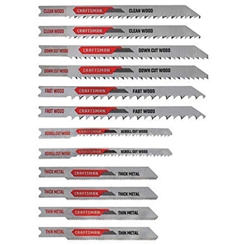 Brand: CraftsmanColor: SilverFeatures: FAST CUT: 6 TPI of jigsaw blades cuts 1/4-inch to 1-7/8-inchDOWNCUT: 10 TPI of the jig saw blade cuts 3/16-inch to 1-1/4-inch materialWOOD CUT: 10 TPI cuts 3/16 to 1-1/4-inchSCROLL CUT: 12 TPI cuts 1/16-inch to 3/4-in