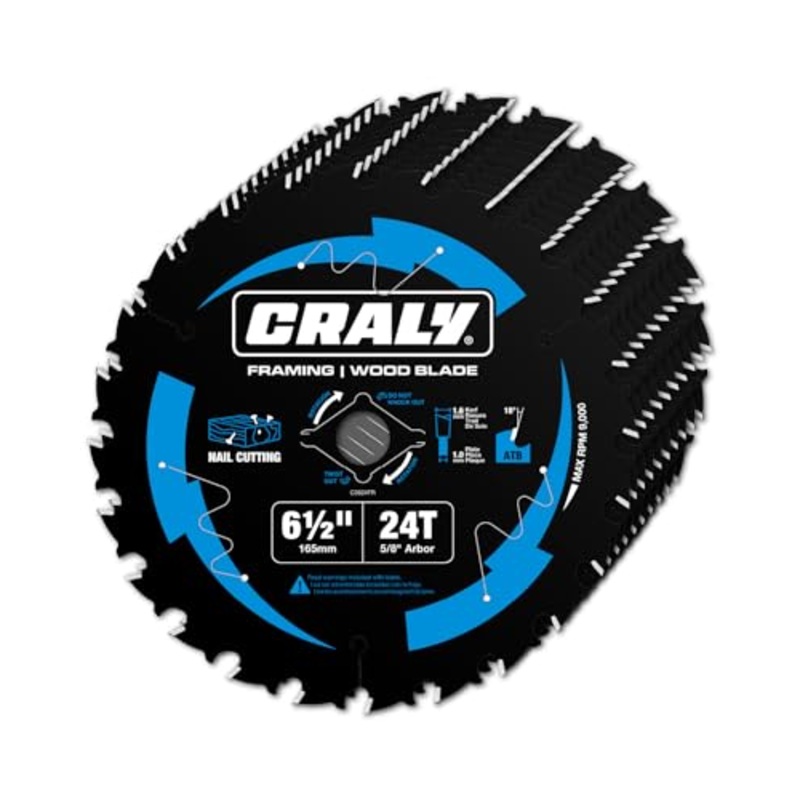Brand: CRALYColor: BlackFeatures: Key specification: Diameter: 6-1/2 inch Teeth: 24 ATB Arbor: 5/8 inch Kerf: 1.6 mmFeatures: Carbide tipped framing blade Thin kerf design Non-stick coating Laser-cut expansion slot Stabilizer vents Diamond knockoutTough ca