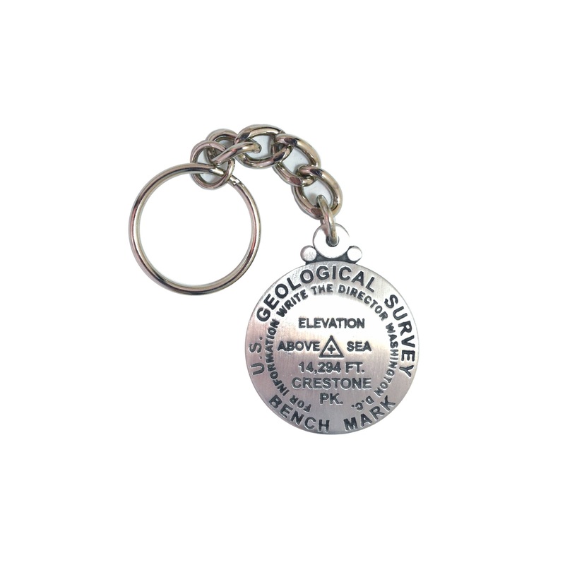 1 1/4 inch diameterCast in fine pewterSplit ring attachmentMounted on story cardPlace Name: Crestone PeakElevation: 14,294 ft.Coordinates: N37 58' 00'' W105 35' 05'' Location: Sangre de Cristo Range, California, USA MarkerSleuth Photo Contributor: No Stati