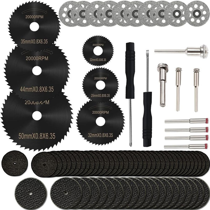 • GOOD VARIETY AND NUMBER OF CUTTING WHEELS – With 36pcs cutting wheels, 20pcs resin cut-off discs, 6pcs HSS circular saw blades, 10pcs diamond cutting wheels, 8pcs mandrels, and even included screwdrivers, this Cutting Discs Set is a perfect addition to your accessories for a rotary tool. Any hobbyists would do well to add this to their toolbox.