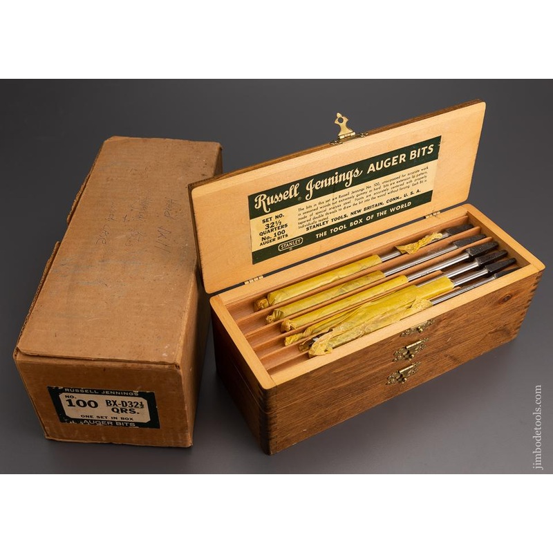 A complete graduated set of 13 unused bits. All marked Russell Jennings. All are bright, clean and sharp. Sizes 4 through 16 which correspond to 1/4 inch to 1 inch. The bits were patented in 1855. The three-tiered box was patented in 1890. They were bought out by Stanley in 1944. The best user auger bits ever made!