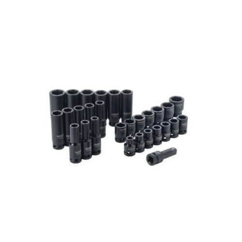DeWALT Impact Socket Set, Yes Impact Rated, Measurement System: Imperial/Metric, 30 pc, 6 Points, Included Socket: 10 to 24 mm, 1/2 in Drive, Drivers Included: No, Carrying Case Container, For Use with: O-Ring and Retaining Pin, CR-440 Steel, Black Oxide,