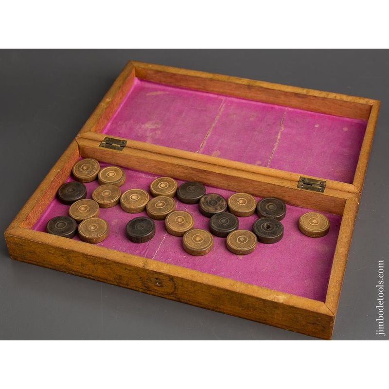 Early Antique Inlaid Game Board Box with 21 Antique Checkers – 83877R