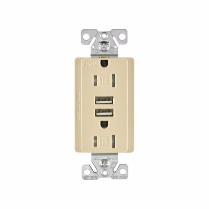 Eaton combination USB charger with duplex receptacle, Tamper resistant, 15A at 125 Vac, 3.A at 5 Vdc, Flush mount, 125 Vac, 5 Vdc, Wire leads, Ivory, Brass, 5-15R, Two-pole, three-wire, grounding, Decorator, Thermoplastic