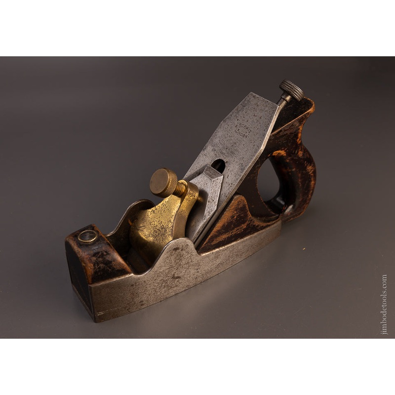 Clean, fine, no issues. Tight mouth. Original Norris 2 1/8 inch parallel iron. NORRIS was established in 1860 and made the world’s finest planes until the 1950s. Considered the Rolls Royce of hand planes, a phrase coined in a Fine Woodworking Magazinearticle in the 1980s. In its day a Norris plane cost 4 times that of a comparable Stanley. The Norris has a much thicker iron and cap iron. It isa heavier plane. Also, the iron sits on wood as opposed to metal. All of these things prevent chatter and create a smoother cut. In 1913 Norris patented his famous adjuster which provides micrometer-like, smooth blade adjustment. In 1922 he patented an improvement to thisadjuster. This adjuster allowed Norris to outdistance his product from his competitors. It is still copied today. Dating your NORRIS: Pre- WW II vs Post WW II — Pre-war planes are better made with better materials. Brazilian rosewood infill. Dovetailed steel construction. Slightly thicker irons 3/16″ with larger Norris logos. 13/16″ wide to 5/8″. Earlier planes — Planes circa 1928 and earlier are found with finial lever cap screws and most often WARD irons. The 1928 Norris catalog shows both finial and flat top cap screws along with Ward and Norris irons. The two aforementioned adjuster patents will also aid accurate dating.