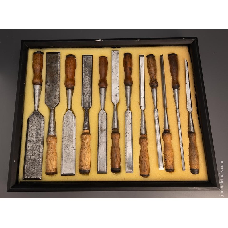 13 inch to 14 1/2 long. 1/8 to 2 sizes. Original handles, some of which have seen hard use. One has small hang hole.T.H. (Thomas Heuston) Witherby was born on June 25, 1802 in Shrewsbury, Massachusetts. Thomas made edge tools from ca. 1842 until he sold ou