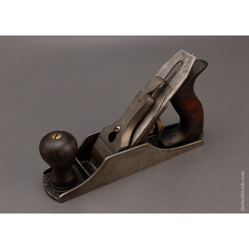Flat top Type 6 ca. 1912-18. Clean, fine, no issues. 88% japanning and fine rosewood. These “flat top” Bedrocks are highly sought after by users. They have the triple screw frog design, which allows you to adjust the frog while the iron is set, allowing you to tighten the mouth with utter precision. Bedrocks also have a frog that mates completely with the edge of the mouth, for a much more solid assembly. This eliminates chatter. Thus, the name Bedrock.”