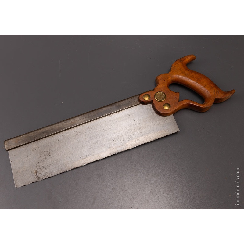Ca. 1889. Straight and sharp. 14 point, 12 inch, crosscut. Fine handle. PART OF A COLLECTION OF 1100 BACK SAWS WE HAVE ACQUIRED AND WILL BE LISTING EVERY DAY FOR THE NEXT YEAR.