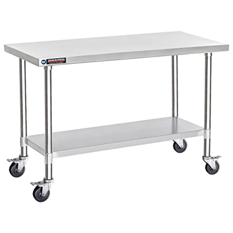 DuraSteel Stainless Worktable is NSF approved for commercial use, and made with 18 gauge stainless steel to largely reduce the possibility of deformation and the chance of corrosion. The superior polished surface makes it easy to clean.The adjustable-height undershelf provides more space to keep all your kitchen necessities, and additional support for the table legs for maximum sturdiness. The legs support up to 300 lbs of weight and are strong enough to not wobble around. Caster wheels feature with brake for stability; to keep casters rolling smoothly, we suggest not to place more than 150 lbs on surface.