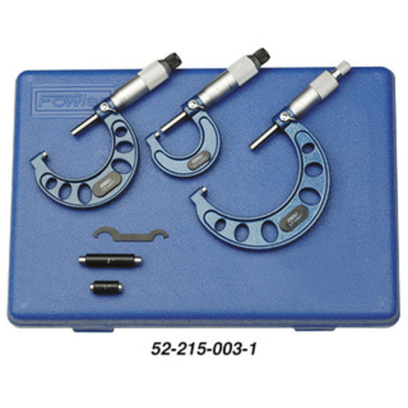 Fowler 0-3" w/Standard, Outside Inch Micrometer 3 Piece Set - 52-215-003-1 Range:0-3 with standards and case, includes 52-240-001-1 thru 52-240-003-1 Hammertone blue baked enamel finish. Microfine graduations on satin chrome finish and carbide tipped measu