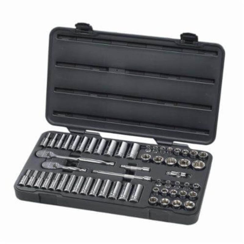 GearWrench Socket Set, Measurement System: Metric/Imperial, 57 pc, 6 Points, 3/8 in Drive, Blow Molded Case Container, Specifications Met: ASME B107.1/B107.5M/B1007.10, Polished Chrome. Manufacturer Part Number: 80550 Manufacturer: Apex Tool Group Brand Na