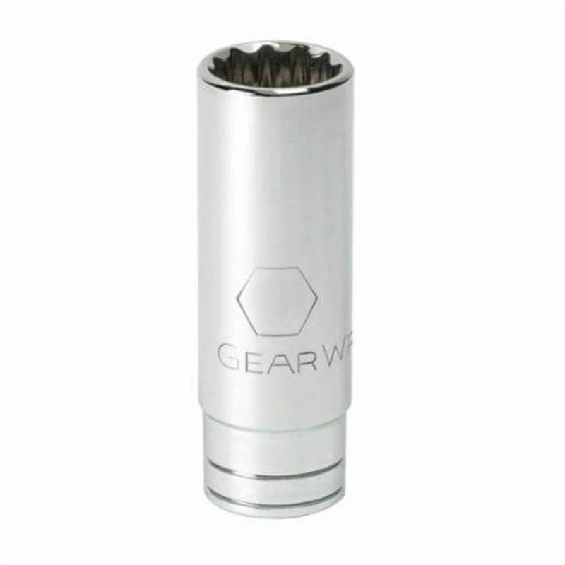 GearWrench Socket, Deep Length, Imperial, Square Drive, 3/8 in Drive, 1 in Socket, 2-1/2 in OAL, 0.567 in Opening Depth, 1.272 in Drive End Width, 1.319 in Socket End Width, 12 Points, 0.335 in Bolt Clearance Depth, Polished Chrome. Manufacturer Part Numbe
