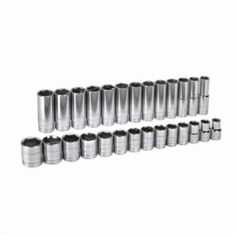 GearWrench Socket Set, Imperial, 27 pc, 6 Points, Included Socket Size: 7/16 to 1-1/2 in, 1/2 in Drive, Specifications Met: ASME B107.1, Polished Chrome. Manufacturer Part Number: 80729 Manufacturer: Apex Tool Group Brand Name: GEARWRENCH UPC: 099575807299