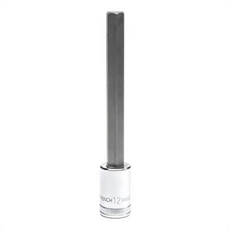 Gearwrench bit socket, long L knurled, measurement system: metric, hex drive, 1/2 in drive, hex bit, 12 mm bit, 4.88 in bit L, 0.94 in drive end W, 5.98 in OAL, S2 alloy steel, full polished chrome holder with black oxide bit. Manufacturer Part Number: 825