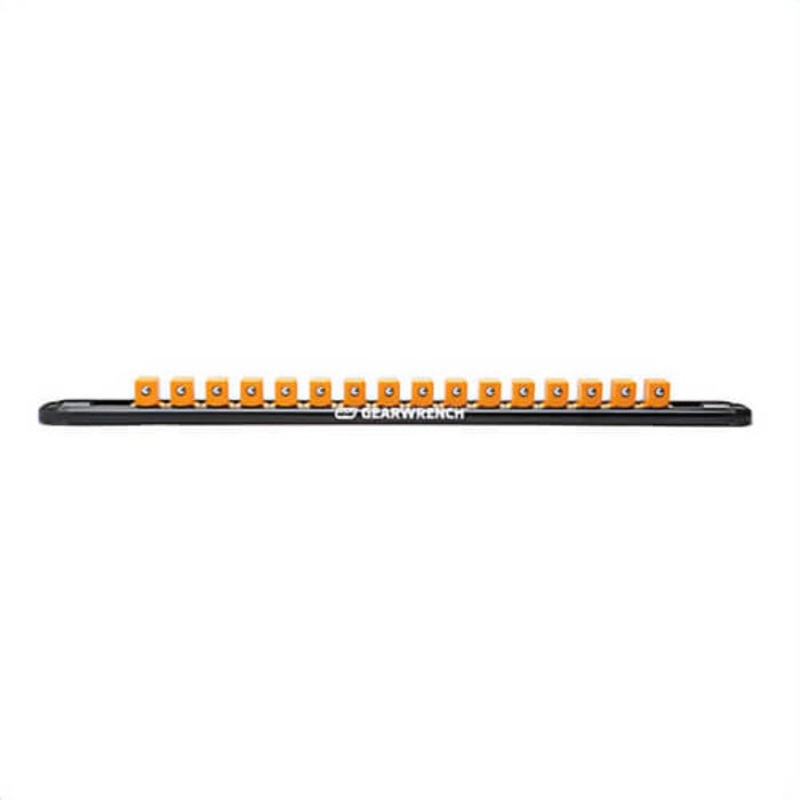 GearWrench Magnetic Socket Rail, 1/4 in Drive, 17.1 in OAL, Aluminum.The GearWrench 83126 Magnetic Socket Rail provides a complete and compact storage solution for 16-1/4 in drive sockets. The rotating clips let you load and unload sockets easily, while the ball bearing retention system holds sockets securely in place. This organizer has a sturdy aluminum frame to keep the rails straight and attaches to any steel surface via the solid magnetic plates on the back. Every socket clip rotates a full 360 so you can easily identify your sockets. Perfect for automotive or industrial mechanics.