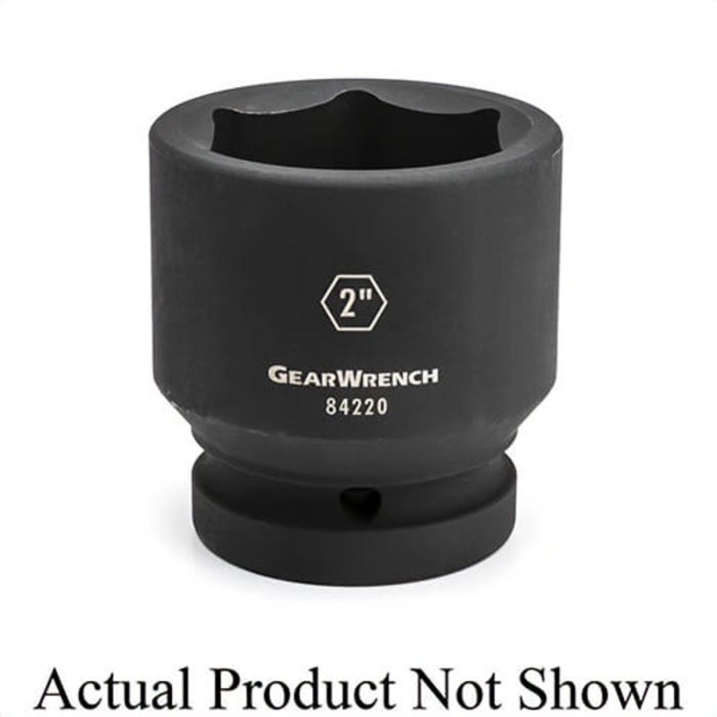 Gearwrench socket, yes impact rated, measurement system: imperial, hex drive, 1 in drive, standard socket, 2-1/4 in socket, 3.307 in OAL, 1.276 in opening depth, 2.402 in drive end width, 3.276 in socket end width, 6 points, 1.562 in bolt clearance depth, chrome molybdenum alloy steel, manganese phosphate.