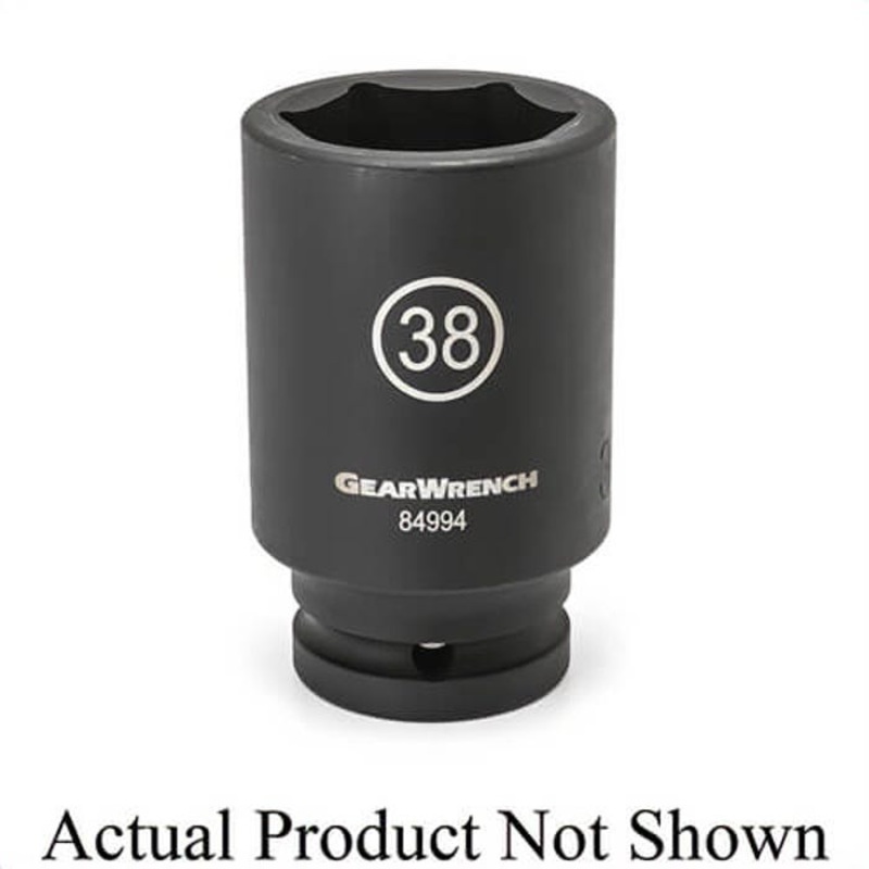 Gearwrench socket, yes impact rated, measurement system: metric, hex drive, 3/4 in drive, deep socket, 27 mm socket, 3.543 in OAL, 0.622 in opening depth, 1.732 in drive end W, 1.654 in socket end W, 6 points, 0.72 in bolt clearance depth, chrome molybdenu