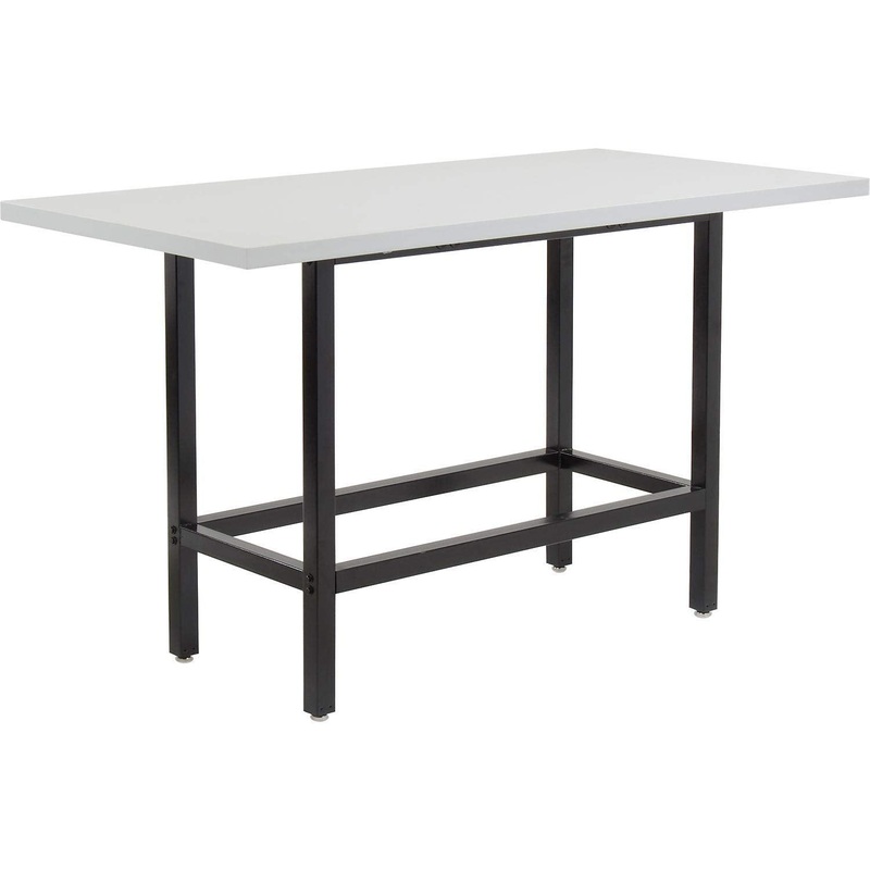Details: Bar Height Computer Workstation combine durability with on-the-go productivity. 42″ height Table provides comfort for standing and a foot rest for sitting when using a standard stool. Durability comes from a heavy duty steel frame supporting a 72″ x 36″ Super-strong, easy to clean bench top made of high pressure plastic light gray laminate-faced wood-core.