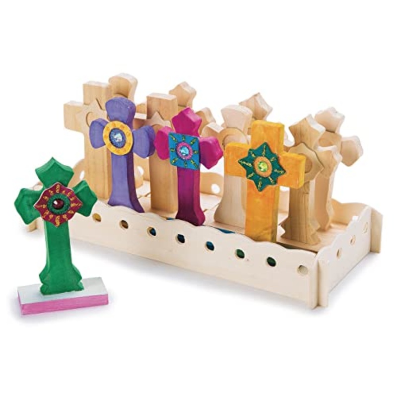 Details: Ready to paint and display! this 12-piece set includes Wooden crosses in assorted styles and a craft wood tray to keep them all together. Crosses are 4-1/2″ with a 2-1/4″ x 1-1/4″ base. Tray is 10-1/2″ x 1-1/2″ x 4-1/2″. comes preassembled and unfinished.