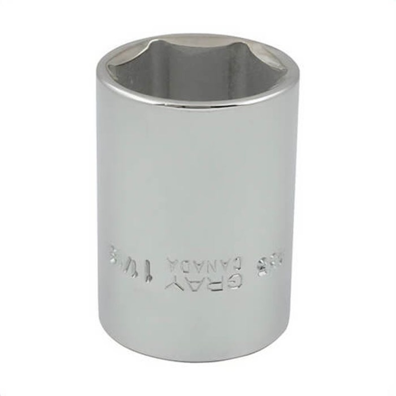Gray Tools socket, standard, measurement system: imperial, 1/2 in drive, hex socket, 1-1/16 in socket, 2 in OAL, 1.42 in drive end W, 1.42 in socket end W, 6 points, 0.98 in bolt clearance depth, tool steel, polished chrome.