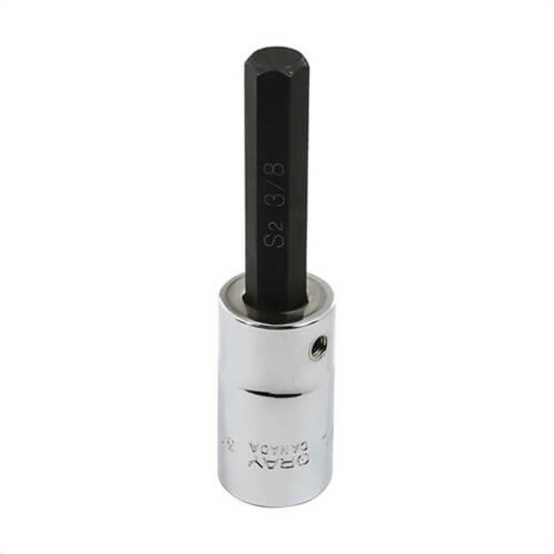 Gray Tools socket bit, standard, measurement system: imperial, 1/2 in drive, hex bit, 3/8 in bit, 1.69 in bit L, 3-1/4 in OAL, polished chrome. Manufacturer Part Number: DW12L Manufacturer: Gray Tools Canada Brand Name: GRAY TOOLS UPC: 067965003620 Standar