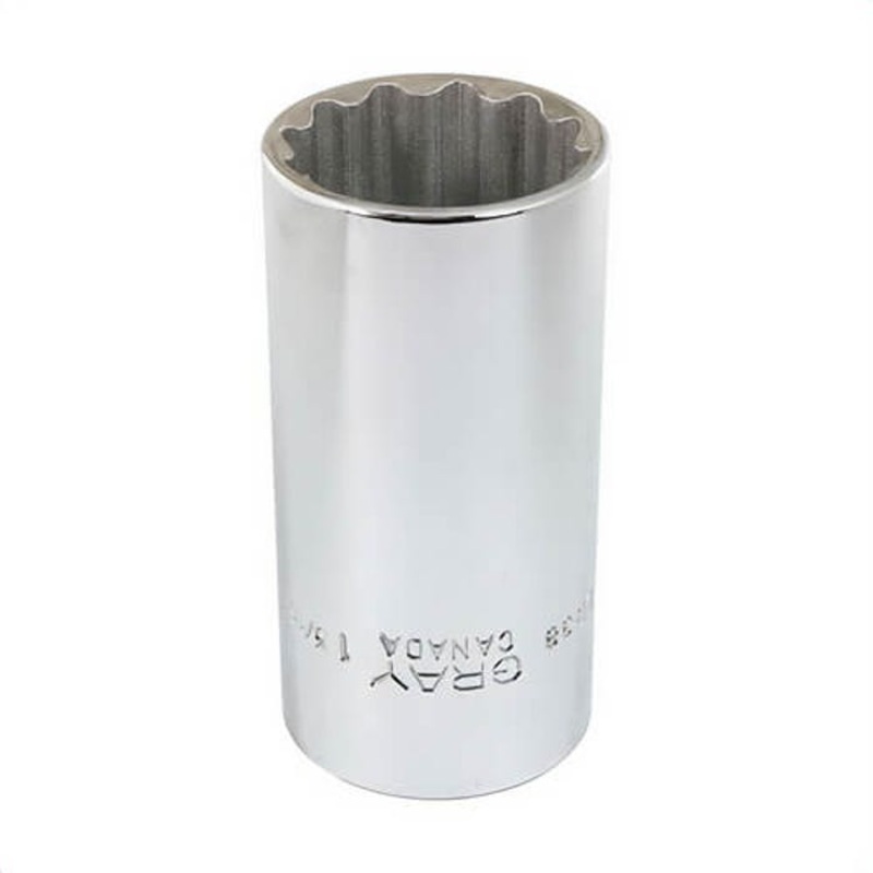 Gray Tools socket, deep, measurement system: imperial, square drive, 1/2 in drive, hex socket, 1-3/16 in socket, 3.07 in OAL, 1.57 in drive end W, 1.57 in socket end W, 12 points, 1.11 in bolt clearance depth, tool steel, polished chrome.