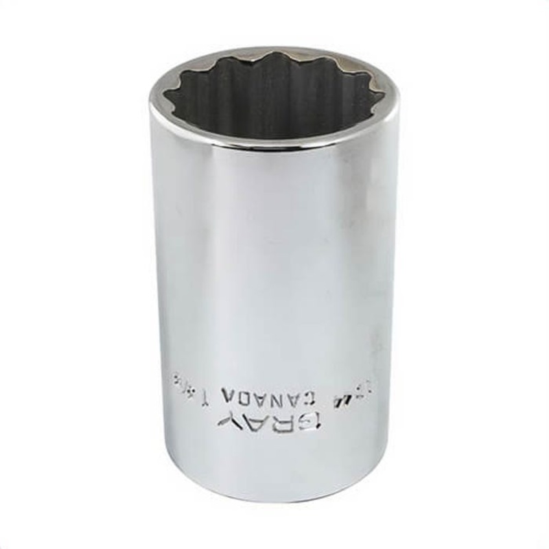 Gray Tools socket, deep, measurement system: imperial, square drive, 1/2 in drive, hex socket, 1-3/8 in socket, 3.07 in OAL, 1.85 in drive end W, 1.85 in socket end W, 12 points, 1.04 in bolt clearance depth, tool steel, polished chrome. Manufacturer Part